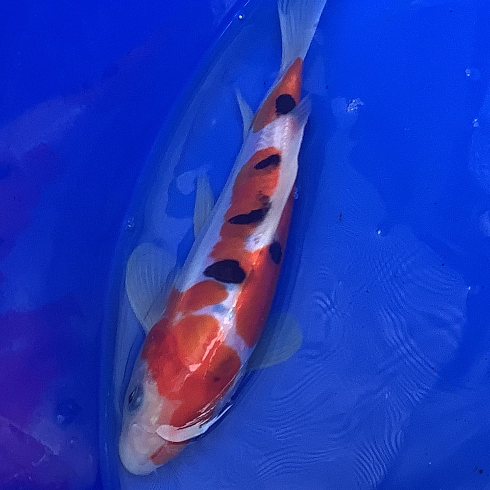 The Shinoda Doitsu Sanke features a smooth, scaleless white body with vivid red and black markings. Its clear pattern and strong form make it a standout koi for any pond.
