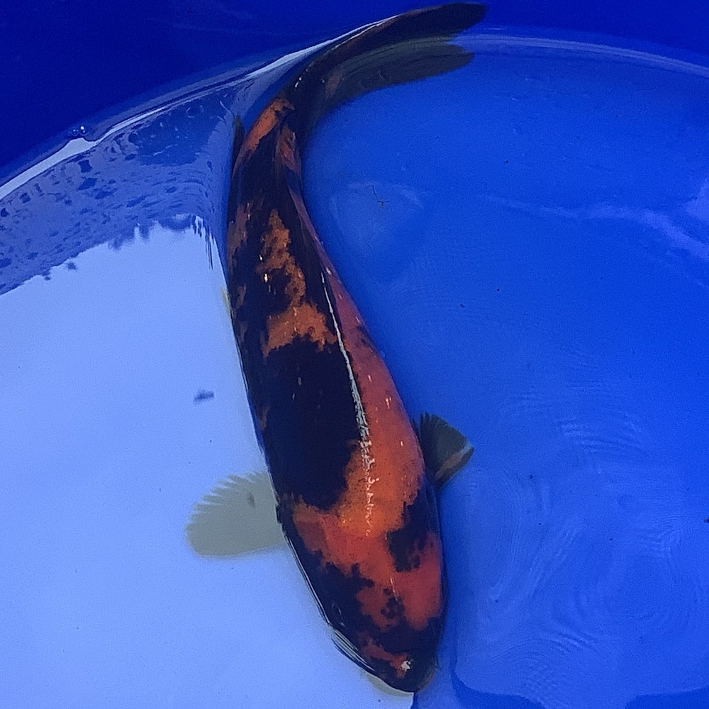 The Shinoda Hi Utsuri is a striking koi with a deep black base and vivid red patterns. Known for strong sumi and clear color contrast, it has a robust body and dynamic design, making it a prized addition to any collection.